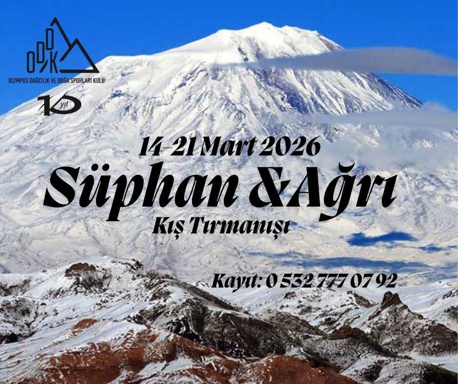 Olympos Dağcılık Kulübü olarak, 10 Yıl Etkinlikleri kapsamında, 14-21 Mart 2026 tarihlerinde, Süphan ve Ağrı Dağı zirve faaliyeti yapılacaktır. Faaliyetimize kış tırmanış tecrübesi olan ve vizeli lisansı olan sporcular katılabilir. Kazma, krampon, kask ve kafa lambası zorunludur.