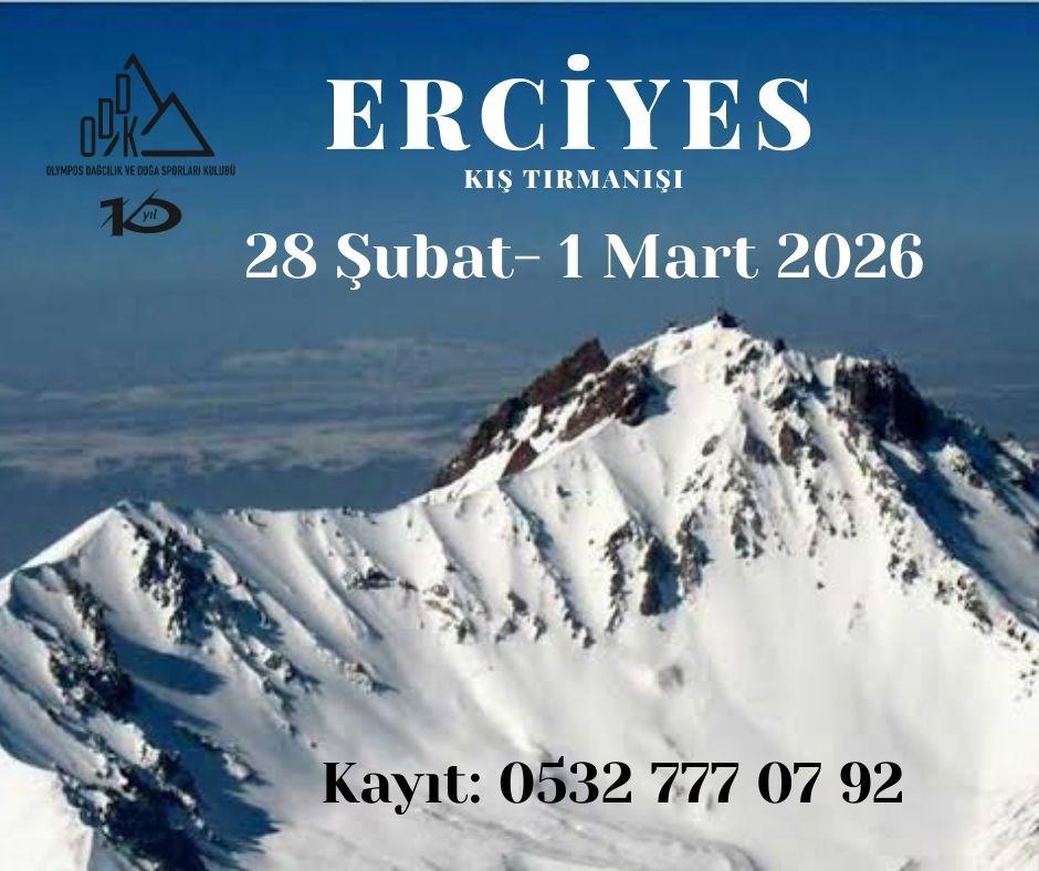 Olympos Dağcılık Kulübü olarak, 10 Yıl Etkinlikleri kapsamında, 28 şubat-1 Mart 2026 tarihlerinde, Erciyes zirve faaliyeti yapılacaktır. Faaliyetimize kış tırmanış tecrübesi olan ve vizeli lisansı olan sporcular katılabilir. Kazma, krampon, kask ve kafa lambası zorunludur.