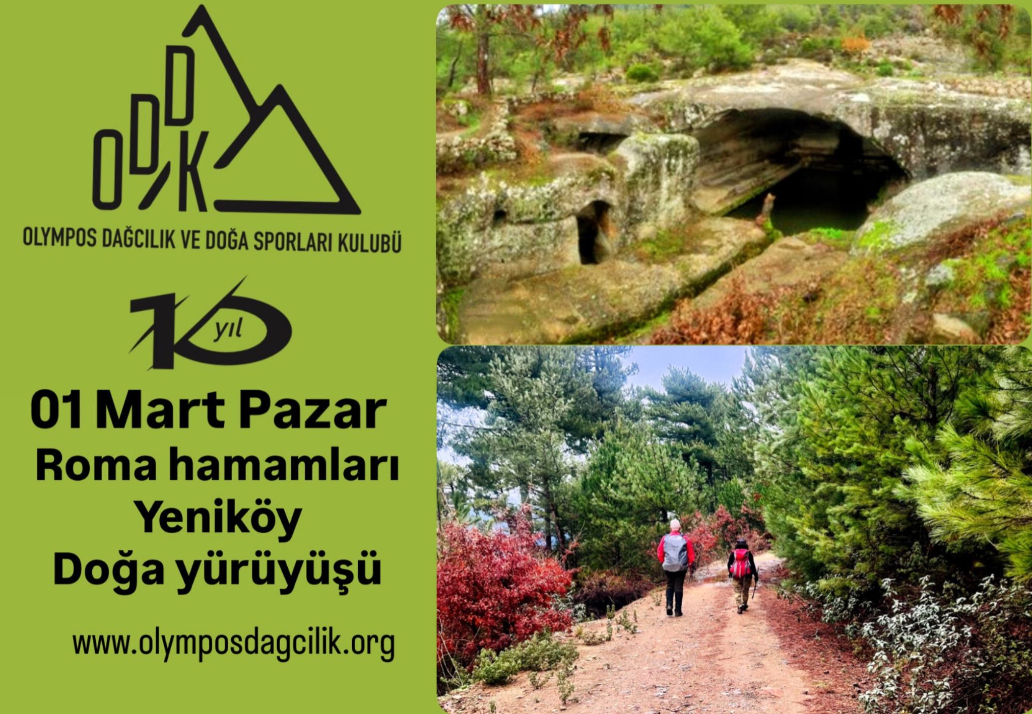 Olympos Dağcılık Kulübü olarak, 27 Ocak pazar günü, doğa yürüyüşümüzü , Menderes Deliömer Köyü -Roma Hamamları-Yeniköy parkurunda yapacağız.Yürüyüşe yeni başlayacaklar için uygun bir rota. Yaklaşık 12-14 km yürünecek ve kolay sayılacak bir parkur.