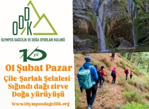 01 Şubat pazar günü Menderes ilçemizin şirin köyü Çile Dağlarında yürüyeceğiz. Muhteşem bir doğada sahip olan Çile köyünde görsel güzelliği ile hayranlık uyandıran Şarlak Şelalesini gezeceğiz ve bölgenin en yüksek noktası olan Sığındı Dağının zirvesine çıkacağız.