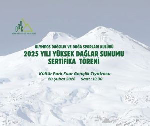 Olympos Dağcılık ve Doğa Sporları Kulübü olarak, 2025 yılında organize ettiğimiz, yüksek dağ faaliyetlerimizi, sizlerle paylaşmak istiyoruz. Faaliyet sunumu ve sertifika törenimize tüm dostlarımızı bekliyoruz.